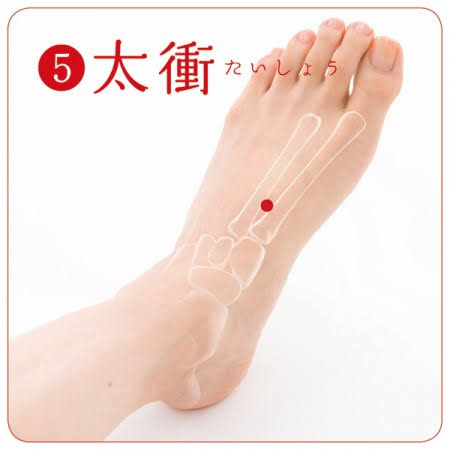 足の甲、親指と人差し指の間にあるツボ。肝の経絡に属します。
